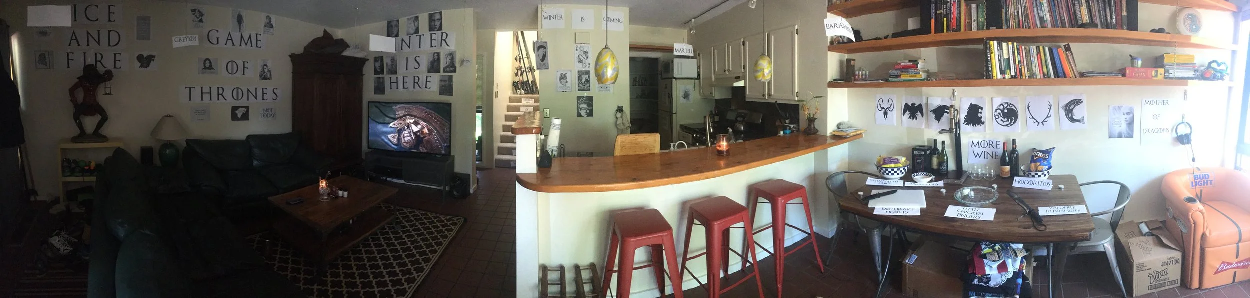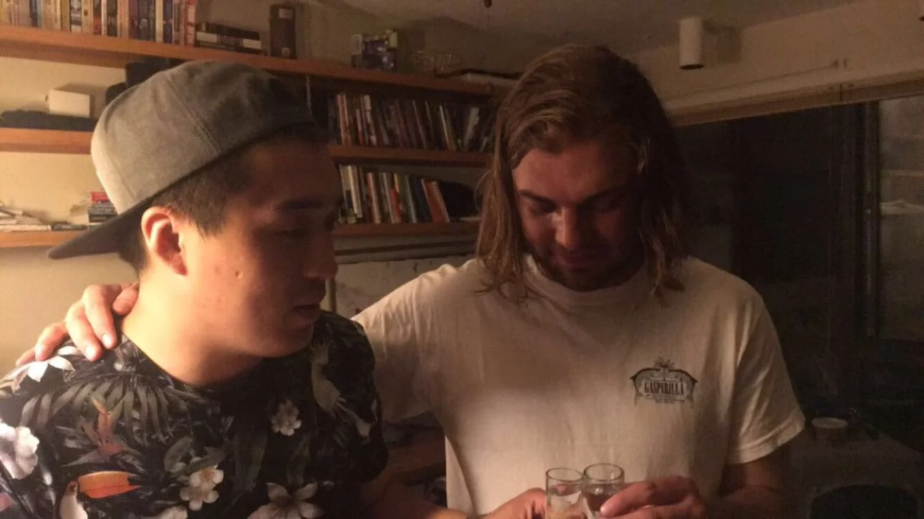 Befriending Chou, the Chinese delivery guy, and all the weird and wild nights that ensued – Chou coming over with a bottle of scotch and a guitar on a Thursday night and serenading us with Chinese love songs; Chou pounding on the bathroom door [Nick puking inside] and screaming "KNOCK KNOCK KNOCKIN' ON HEAVENS DOOOOOR"; Chou walking into our house and, upon seeing me doing yoga on the floor, saying "AH! I thought you make handjob on floor!"; Chou buying us Coronas at the bar until we literally had to start giving them away to strangers; Chou walking into our house with pants covered in piss, proceeding to pass out onto our tile floor; Chou drinking RJ into the ground (pictured, left).