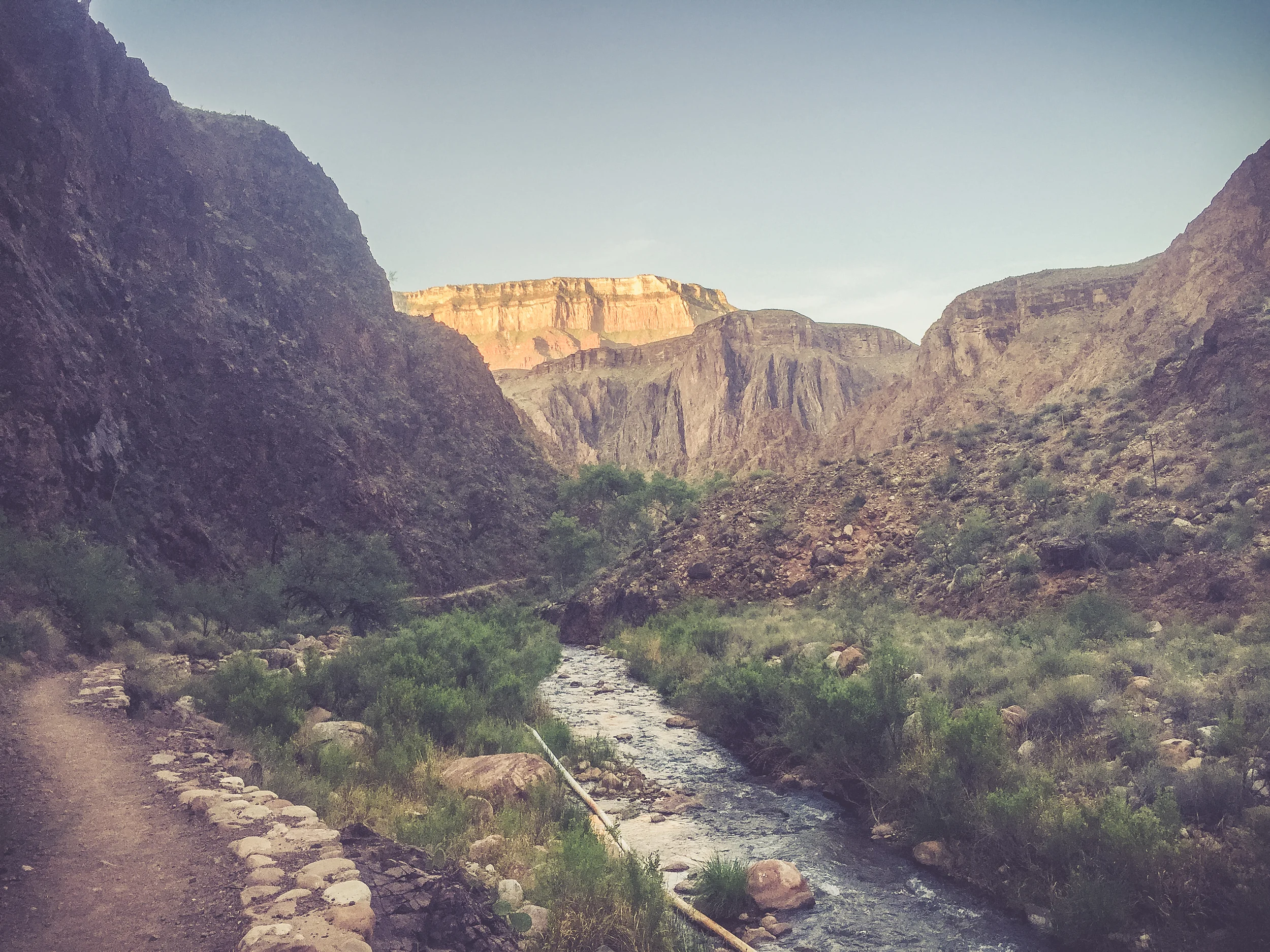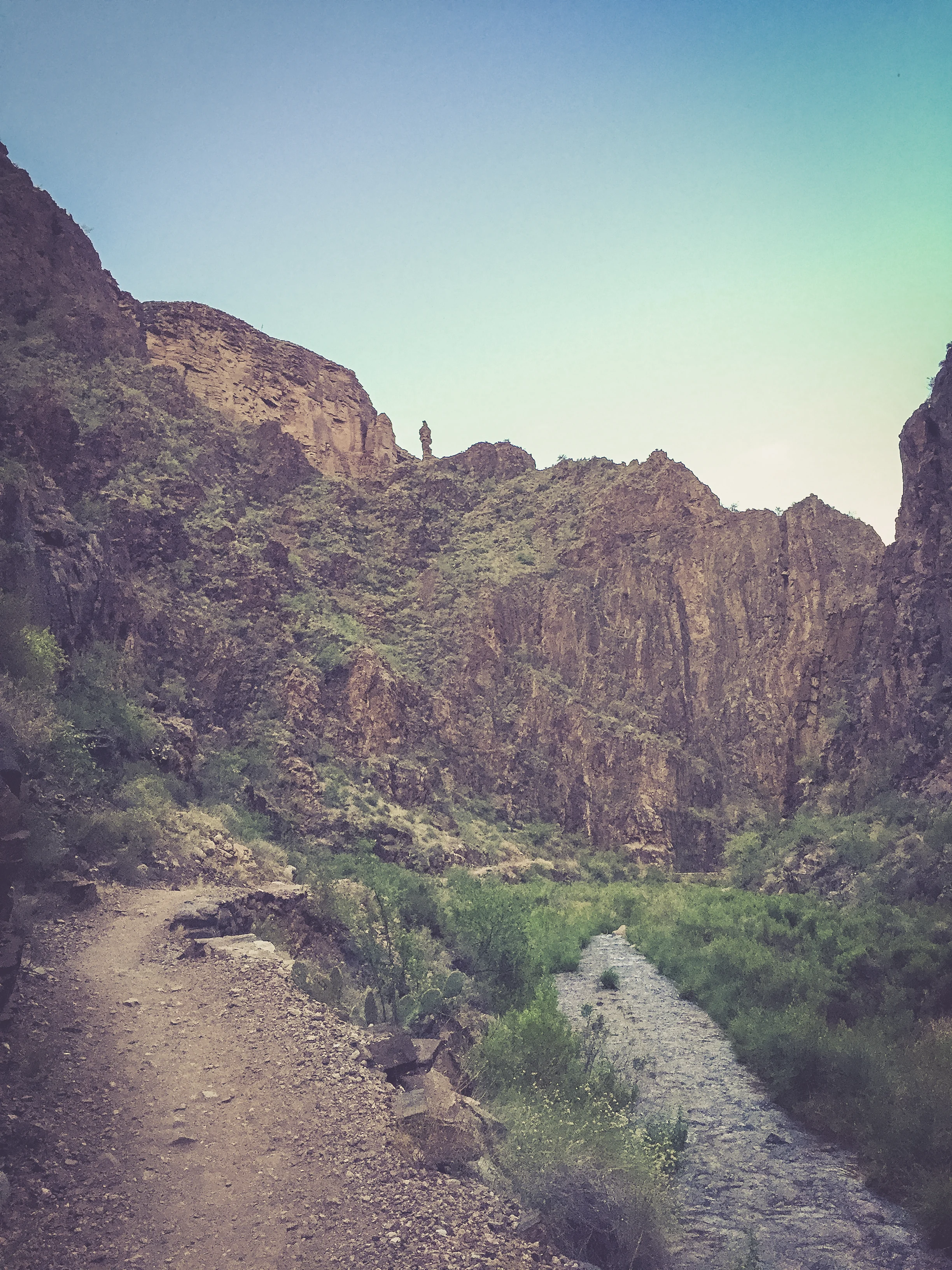 It was a perfect moment, one of the emotional highs of the trip, really of my life. Flat ground flew beneath my feet as I reverently studied my surroundings. The trail crossed a bridge and continued alongside a bubbling streambed, ‘Streamline Promenade’ as Van Morrison would put it. I passed a human for the first time around 5 and remarked on how beautiful the day already was. “Best part of the day” he agreed. Right he was. Right he was. I was feeling great, damn ready for the challenge, though the notorious heat had yet to arrive. The next 10 hours were about to heat up.