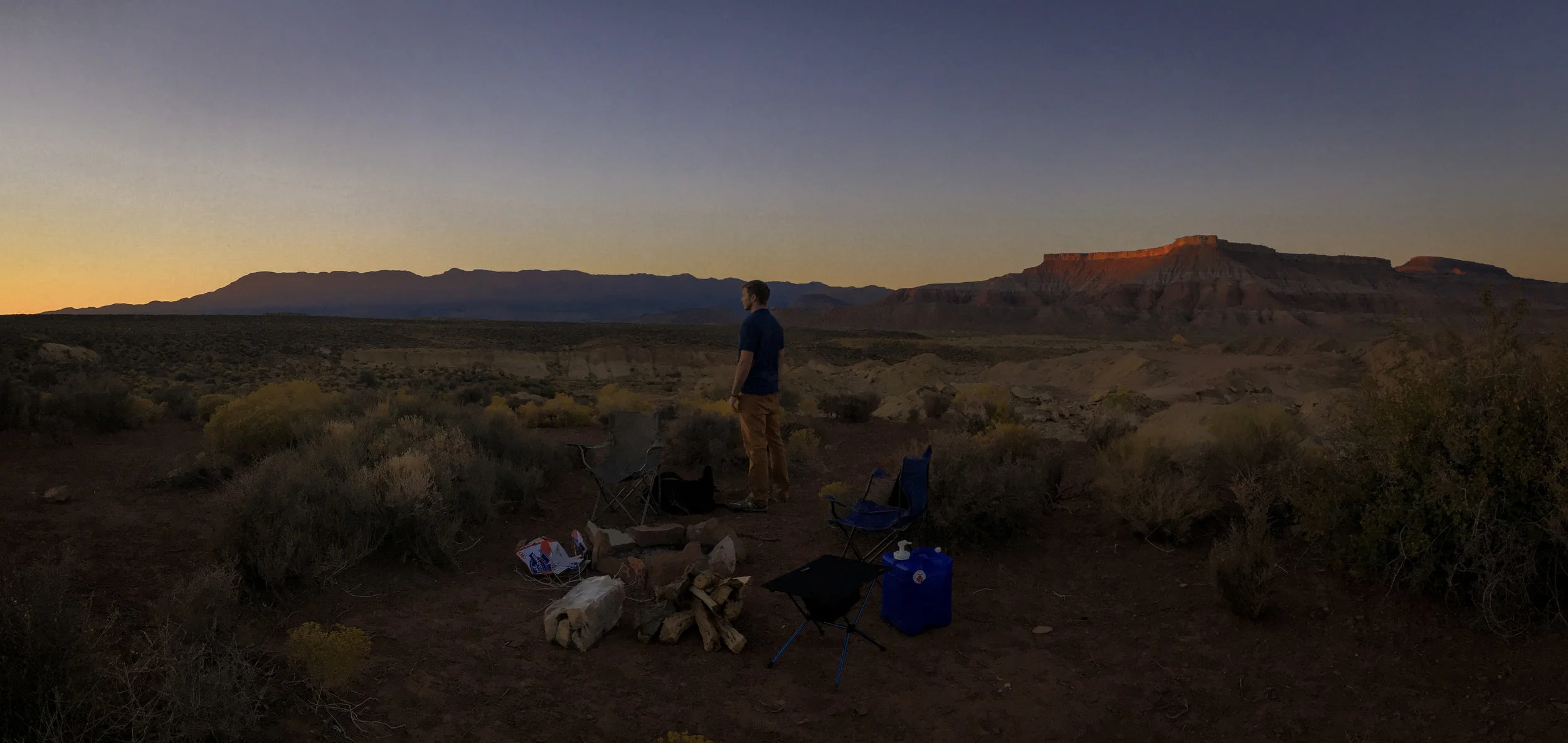 Writing by moonlight and by flame of the campfire as Astral Weeks sneaks on. In Zion we sit, pondering, Nick silently working in Lightroom as I lightly tap away pen to paper. Another grand day upon the road (like each and every one). Rain clouds unloaded upon us last night – a total deviation from the forecast – bringing the longest storm I’ve heard in years, hours of pitter patter upon our tent, into the morning hours upon waking, soaking our departure and the belongings we left out overnight – including the wood which saturatedly pops before us now.