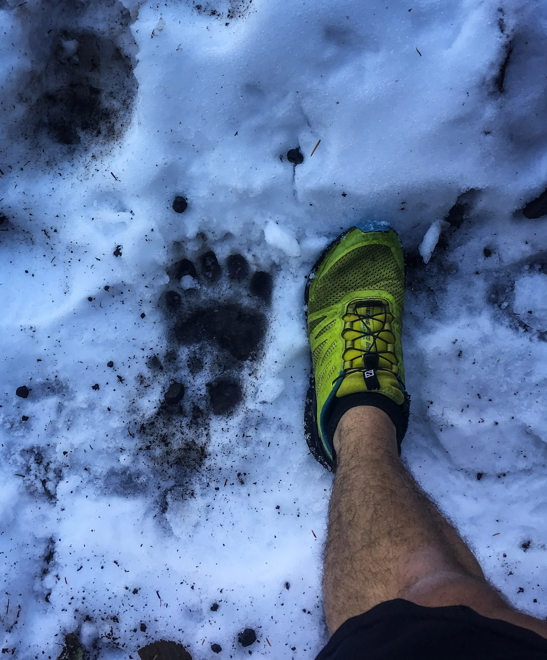 I hit the trail by 12:30. The dirt was moist and cool, the grade steady, and the air cold, though within the first few minutes I began sweating and chugging up the slope, crushing the first bit and climbing from soggy soils to a crispy light dusting, into slushy messes of inch-deep pack with glacial puddles I tried to avoid with each slippery stride, my trail-runner-clad feet growing numb with each errant step. The alpine air stung the nostrils and the snowier sections - though boasting palpably fresh air - were frigid and I sped up to stay warm, basking in each rare window of sunshine.