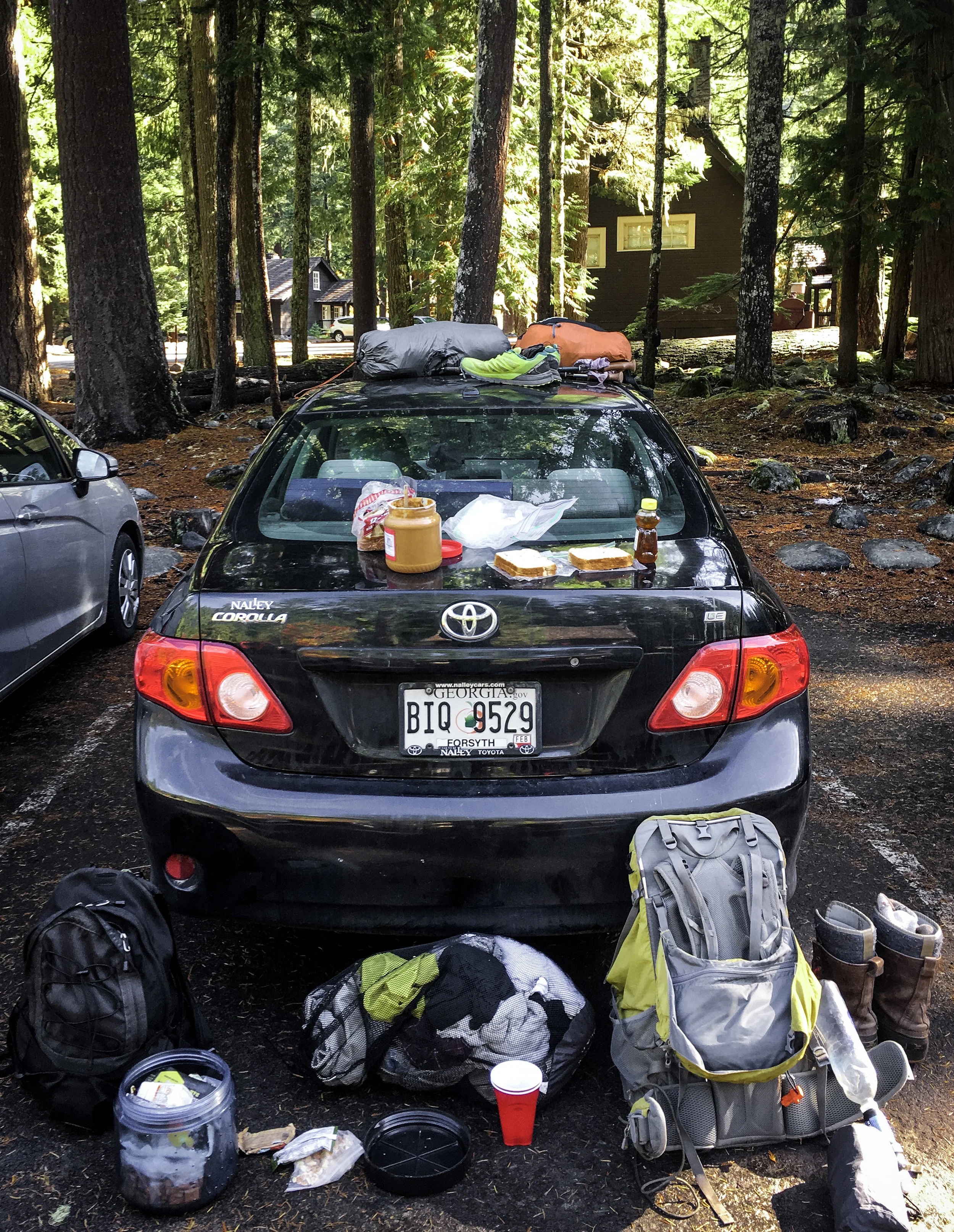 I reevaluated and selected a trail and I got my permit and went out to the parking lot to load a pack - dumping pads and bags and clothes and food onto the roof of my car and in piles behind it, and making PB & honey sandwiches on the trunk out of my giant tub of peanut butter and my dwindling bag of bread, now tattered with mouse bites in its side [sidenote: one mouse has been eradicated]. A woman walking by stopped and looked at me - “Can I take your picture?”, she asked. I turned around confusedly. “I’ve… I’ve just… I’ve never seen a real hiker before.” I laughed and agreed, not knowing exactly what she meant. Then I turned around and looked at my car. “Ah. I see.”